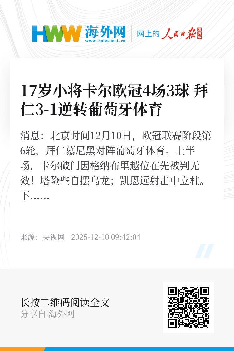央视网消息:北京时间12月10日,欧冠联赛阶段第6轮,拜仁慕尼黑对阵葡萄牙体育。上半场,卡尔破门因格纳布里越位在先被判无效!塔险些自摆乌龙;凯恩远射击中立柱。下半场,基米希自摆乌龙,格纳布里、卡尔4分钟2球反超比分!随后格纳布里助攻塔扩大领先优势!阿方索·戴维斯伤愈替补登场。最终,拜仁主场3-1逆转葡萄牙体育,各项赛事取得4连胜!