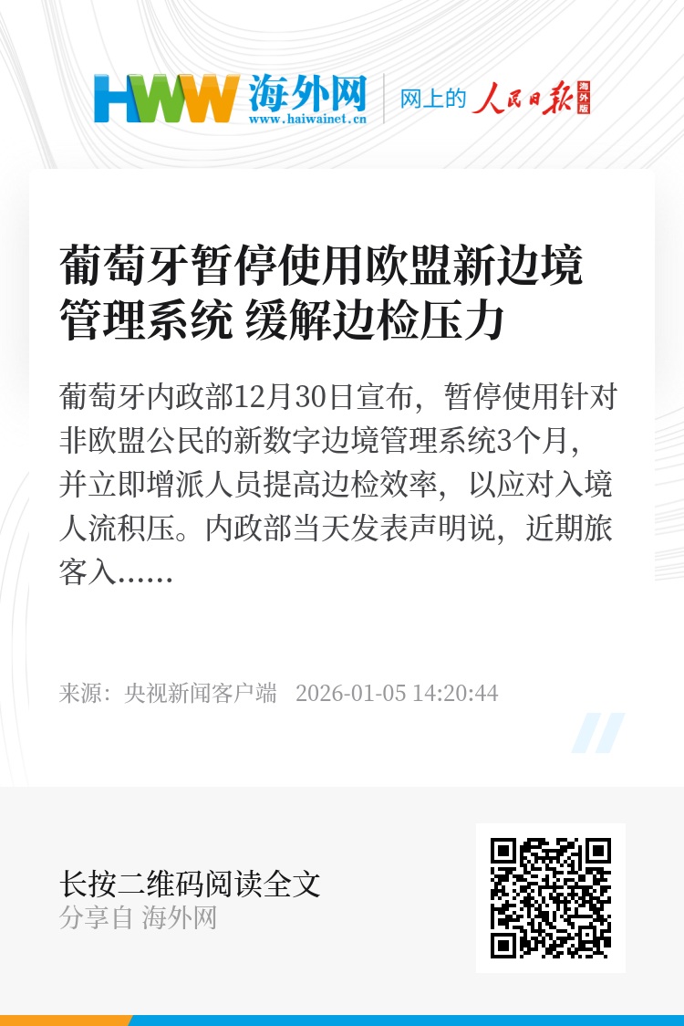 葡萄牙内政部12月30日宣布,暂停使用针对非欧盟公民的新数字边境管理系统3个月,并立即增派人员提高边检效率,以应对入境人流积压。