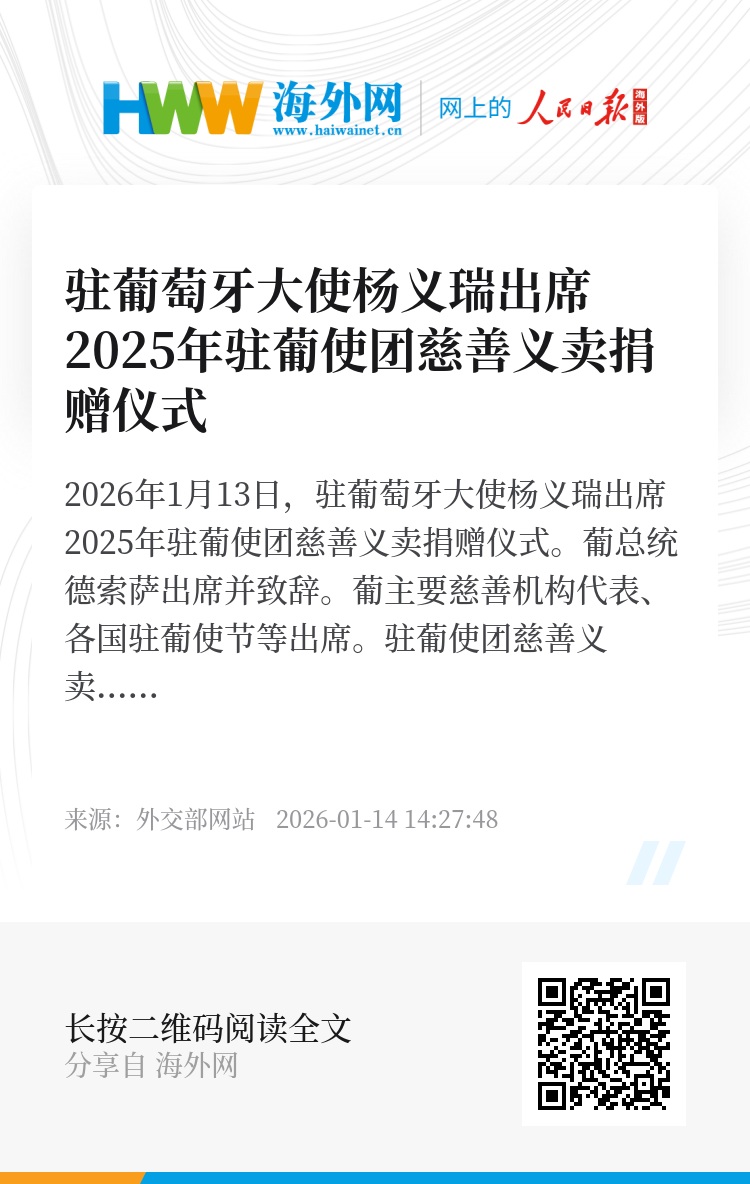 2026年1月13日,驻葡萄牙大使杨义瑞出席2025年驻葡使团慈善义卖捐赠仪式。葡总统德索萨出席并致辞。葡主要慈善机构代表、各国驻葡使节等出席。