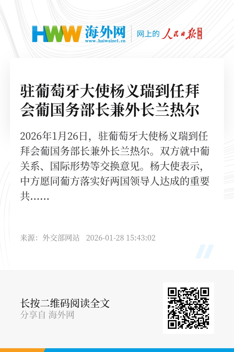 2026年1月26日,驻葡萄牙大使杨义瑞到任拜会葡国务部长兼外长兰热尔。双方就中葡关系、国际形势等交换意见。