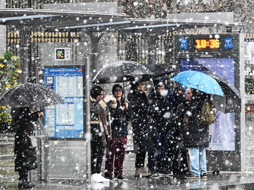 1月28日,在西班牙首都马德里,人们冒雪在公交车站候车。新华社记者程敏摄