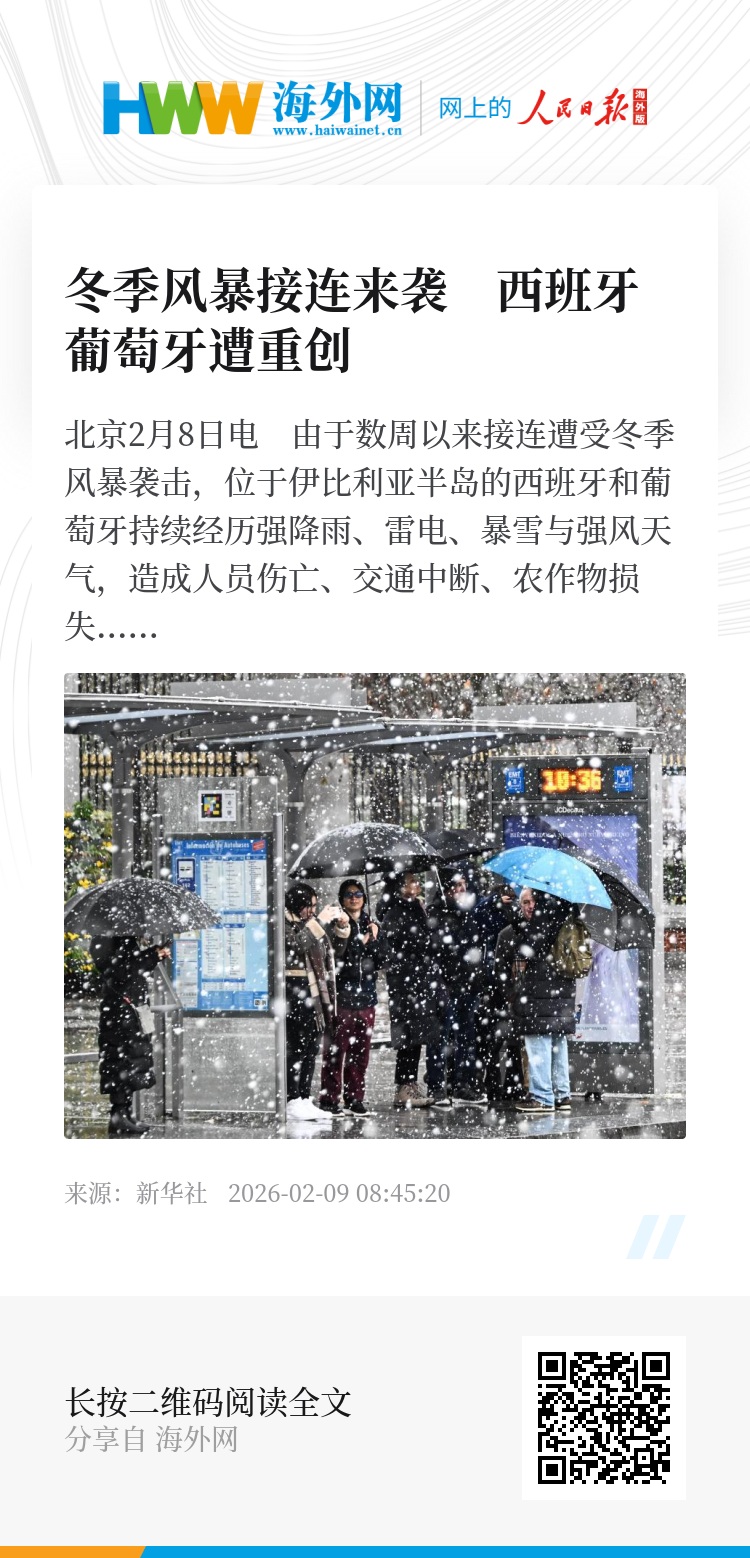 新华社北京2月8日电 由于数周以来接连遭受冬季风暴袭击,位于伊比利亚半岛的西班牙和葡萄牙持续经历强降雨、雷电、暴雪与强风天气,造成人员伤亡、交通中断、农作物损失。气象预报显示,极端天气仍将持续。