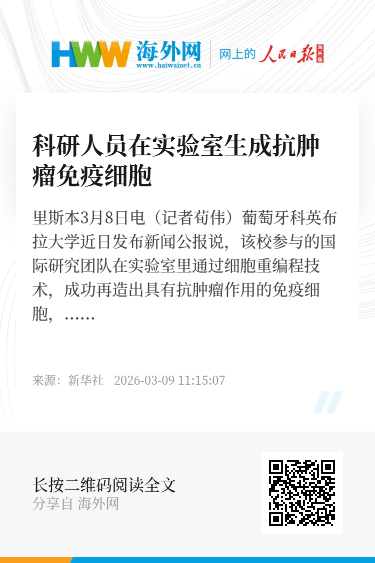 新华社里斯本3月8日电(记者荀伟)葡萄牙科英布拉大学近日发布新闻公报说,该校参与的国际研究团队在实验室里通过细胞重编程技术,成功再造出具有抗肿瘤作用的免疫细胞,这为开发新的细胞免疫治疗方法提供了新方向。