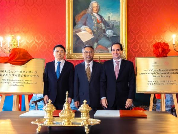 中国人民大学校长马怀德、中国驻葡萄牙大使杨义瑞、科英布拉大学副校长若奥·努诺·卡尔文·达席尔瓦出席仪式并致辞,共同为中葡文明交流互鉴合作研究中心揭牌。