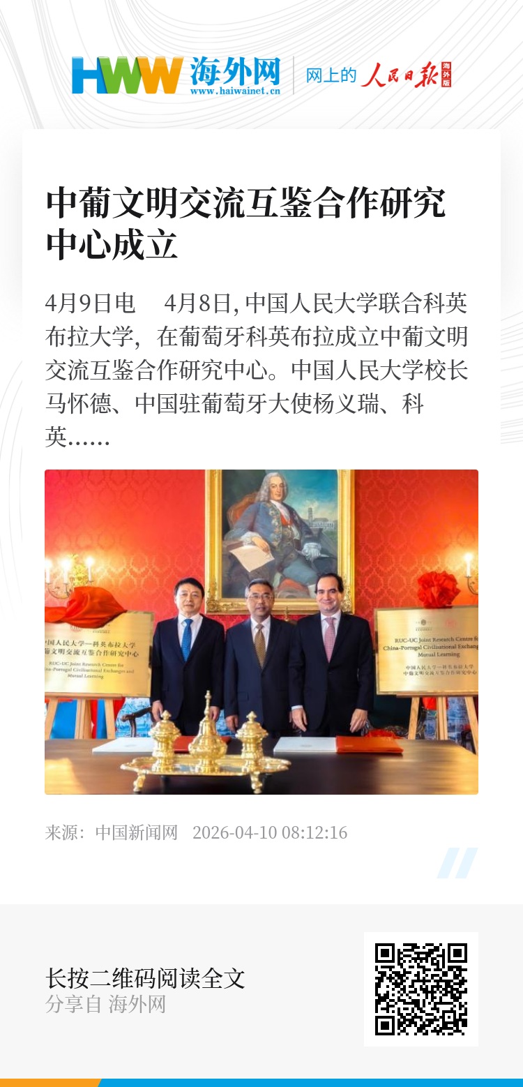 中新网4月9日电 4月8日,中国人民大学联合科英布拉大学,在葡萄牙科英布拉成立中葡文明交流互鉴合作研究中心。