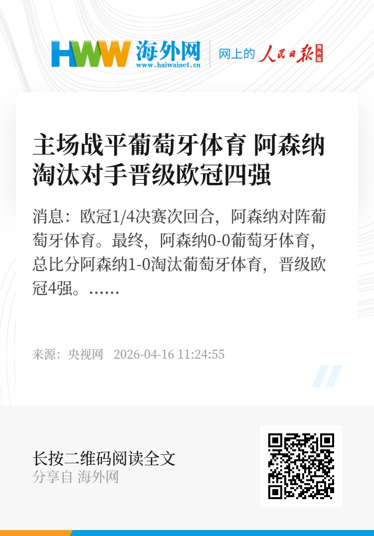 央视网消息:欧冠1/4决赛次回合,阿森纳对阵葡萄牙体育。最终,阿森纳0-0葡萄牙体育,总比分阿森纳1-0淘汰葡萄牙体育,晋级欧冠4强。