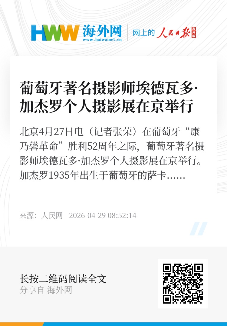 人民网北京4月27日电(记者张荣)在葡萄牙“康乃馨革命”胜利52周年之际,葡萄牙著名摄影师埃德瓦多·加杰罗个人摄影展在京举行。